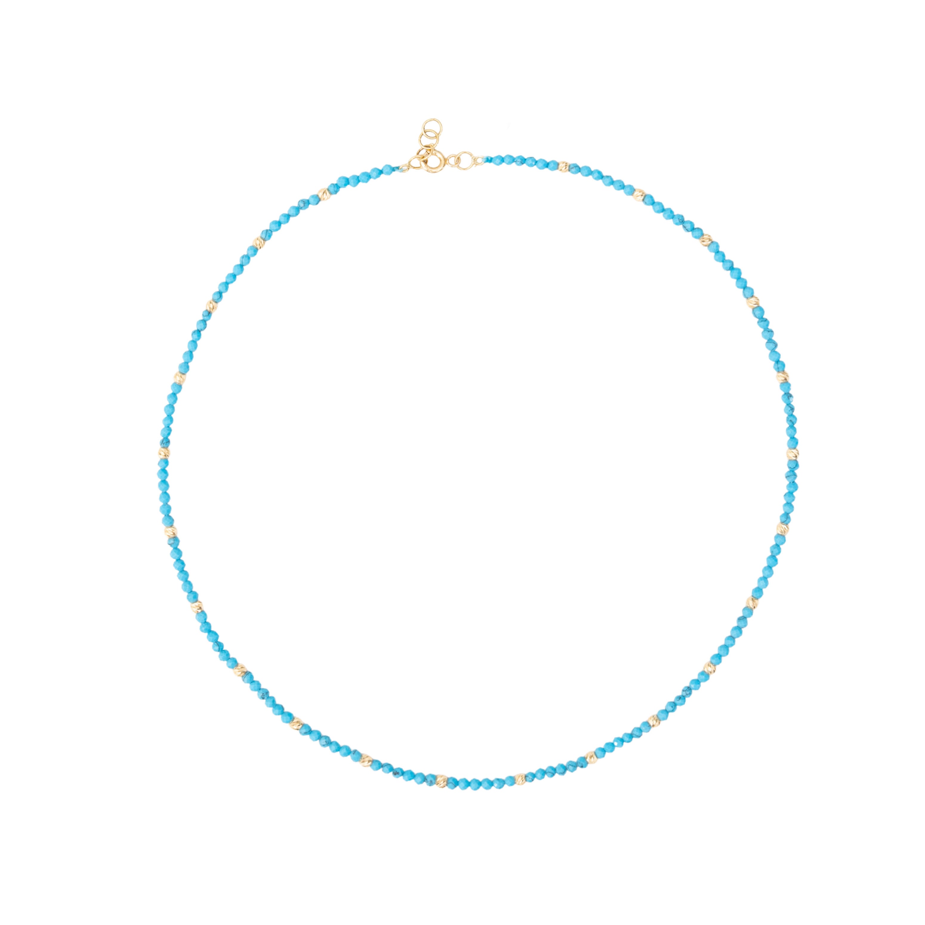 This necklace features vibrant blue turquoise stones highlighted with delicate gold dots. A striking yet minimalist design, it brings a pop of color to any look.