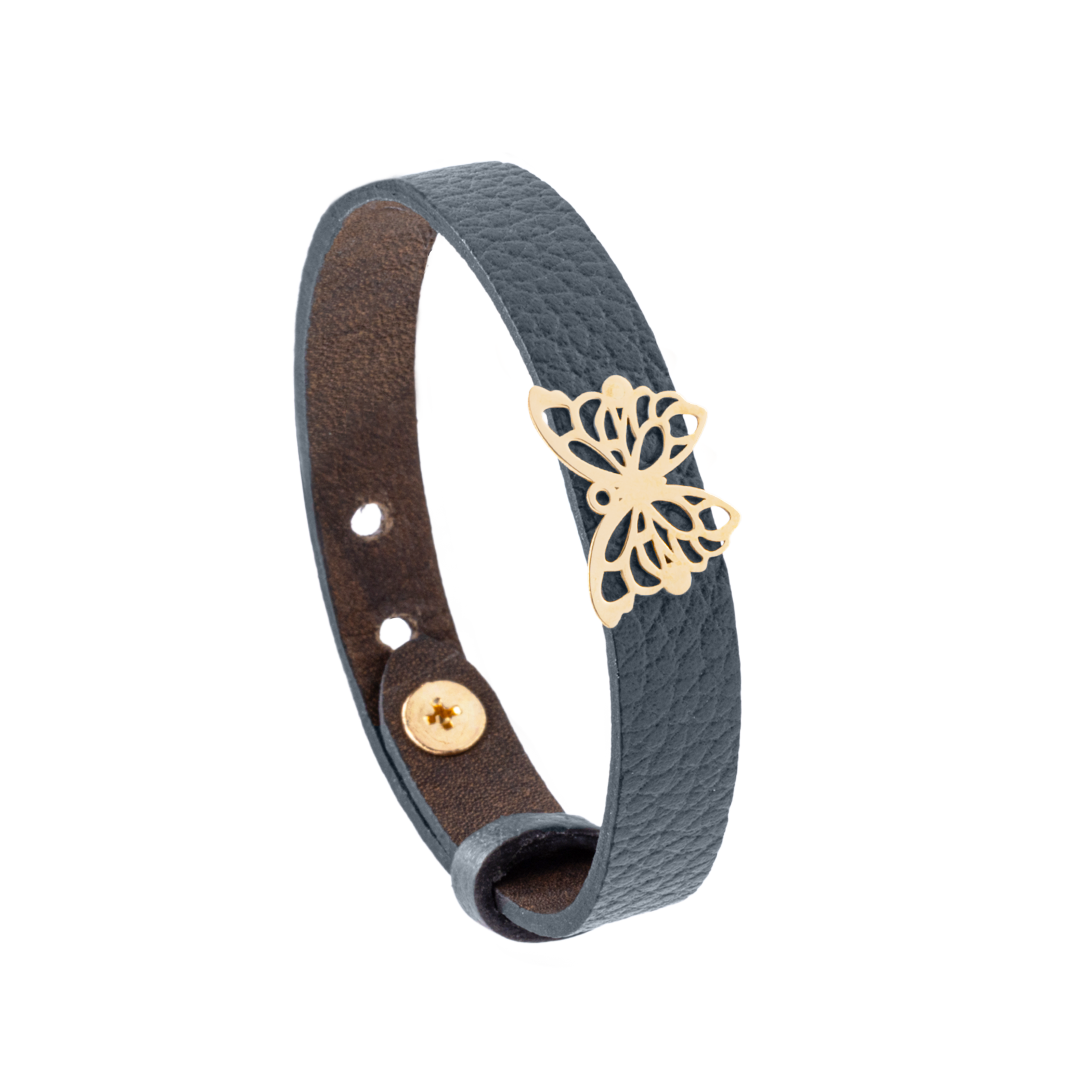 • This bracelet pairs genuine leather with a gold butterfly motif. The adjustable closure, ensures a perfect, tailored fit.