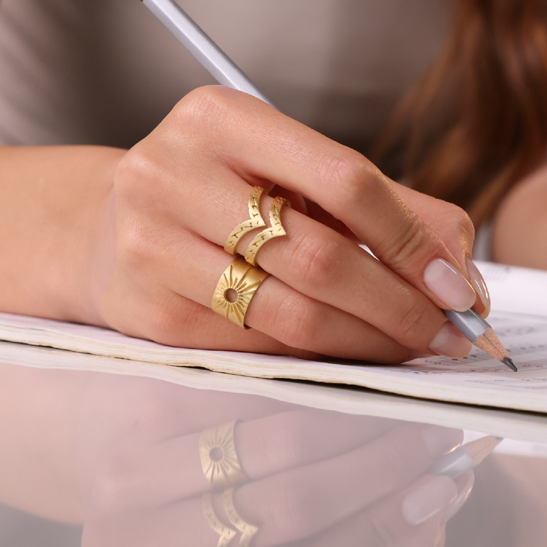 This vintage-inspired ring brings classic sophistication to your jewelry collection with its sun-inspired band pattern and matt finish. The adjustable design ensures a comfortable fit.